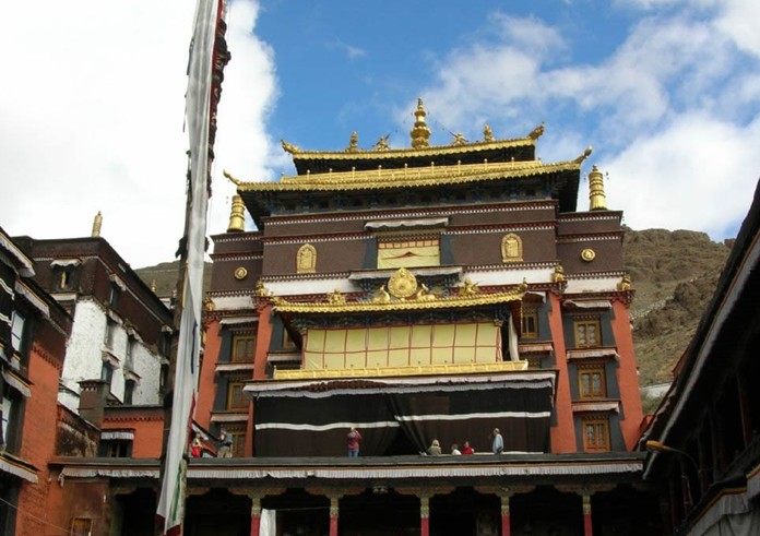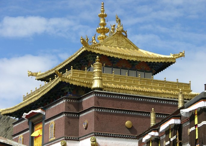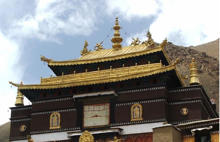 度母殿位于寺院經(jīng)堂后面三座佛殿東側(cè),三座佛殿中居中的是釋迦牟尼殿,西側(cè)是彌勒殿;釋迦殿內(nèi)供5米多高的釋迦牟 尼鎏金銅像,據(jù)說(shuō)像體內(nèi)有釋迦舍利,還有宗咯巴的頭發(fā)以及根珠巴的經(jīng)師西繞森格的頭蓋骨。度母殿藏語(yǔ)稱卓瑪康,供2米高的白度母銅像,兩旁還有泥塑的綠度母像。