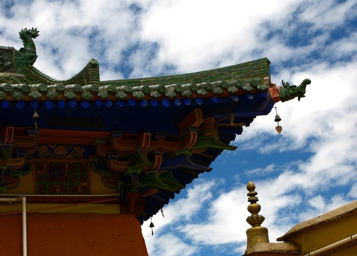 寺的大殿,分前后正殿及左右配殿。大殿的底層是合成一體,二層以上則四殿分立。皆為木構(gòu)梁架琉璃瓦頂。這是一座具有西藏傳統(tǒng)形式與內(nèi)地結(jié)構(gòu)造型相結(jié)合的,特殊風(fēng)格的古建筑群。