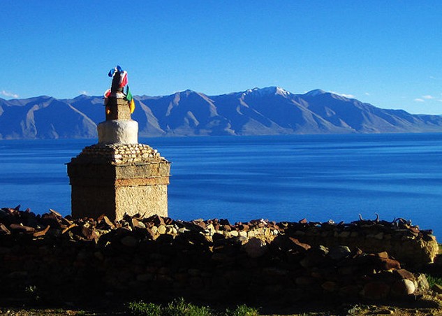 當惹雍錯被群山簇擁,唯南岸達爾果山東側有一缺口。據(jù)傳當惹雍錯當初是個魔鬼湖,后來象雄第一代王子也即是苯教的締造者敦巴辛繞制服了湖中的魔鬼,成為了神湖。達爾果山一列有七峰,峰頂終年白雪覆蓋,如七個戴了白帽的巨人并排站立忠實地守護著當惹雍錯。這里山光水色簡直就是圣景,它和當惹雍錯—起被人們奉為苯教的神山圣湖,其地位與佛教所認為的世界中心的崗仁波齊和瑪旁雍錯身價相等,且傳說湖底是相通的。