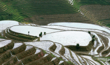 從流水湍急的河谷,到白云繚繞的山巔,從萬木蔥蘢的林邊到石壁崖前,凡有泥土的地方,都開辟了梯田。垂直高度五六里,橫向伸延五六里。那起伏的、高聳入云的山,蜿蜓的一級一級登上藍天。梯田,像天與地之間一幅幅巨大的抽象畫。每個看見這一景色游客的心靈都會被深深地震撼,這是一種難以言表的,一種被大自然的雄奇以及人的偉力所引起的震撼。 這里一年四季景觀各異,春來,水滿田疇,如串串銀鏈山間掛;夏至,佳禾吐翠,似排排綠浪從天瀉;金秋,稻穗沉甸,像座座金塔頂玉宇;隆冬,瑞雪兆豐年,若環(huán)環(huán)白玉砌云端。這種景象稱得上是人間一大奇觀。有趣的是,在這浩瀚如海的梯田世界里,最大的一塊田不過一畝,大多數(shù)是只能種一二行禾的碎田塊,因此有“蓑衣蓋過田”的說法。