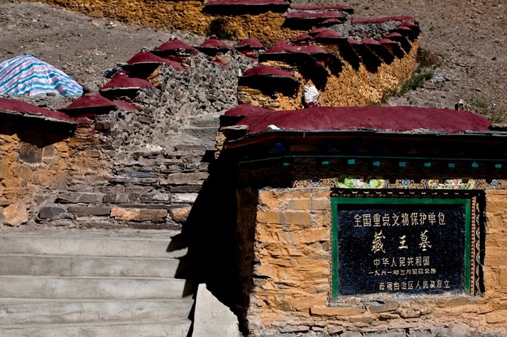 藏王墓屬全國重點文物保護(hù)單位,位于山南窮結(jié)縣宗山的西南方,背靠丕惹山(意為增長之山),是吐蕃王朝時期第29代贊普至第40代(末代)贊普、大臣及王妃的墓葬群,總面積385平方米。各陵墓封土高大,為土壘成的高臺丘墓。其上層土墩為橢圓形,墩頂極平坦,東西長約130米;下層為長方形土臺,周邊不齊整。藏王墓的數(shù)目現(xiàn)難確定,能看到的有八九座??拷舆叺拇竽箵?jù)說是松贊干布之墓,與之相鄰的是赤松德贊的墓,墓旁有巨大功德碑。在9世紀(jì)中后發(fā)生的奴隸起義中,贊普陵墓全被搗毀,現(xiàn)在的藏王墓只是衣冠冢而已。
