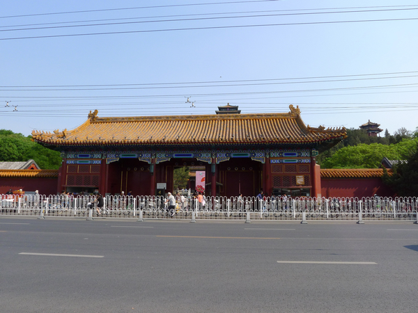 ?、谏阶罄镩T。公園的東門,坐西朝東。黃琉璃筒瓦歇山頂。面闊3間,進(jìn)深1間。單昂三踩斗拱,旋子彩畫。