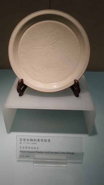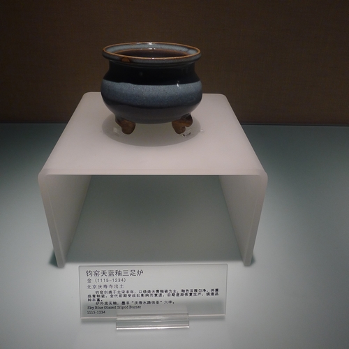 瓷器展廳中展出了北京作為都城歷史時(shí)期出土和傳世的瓷器170組件,青花釉里紅海水云龍紋天球瓶在2000年就已價(jià)值1000萬元。另外宋遼金時(shí)期的定窯白釉童子誦經(jīng)壺、元大都出土的青花鳳首扁壺、乾隆松石綠地粉彩蕃蓮紋多穆壺等名貴瓷器都是難得一見的稀世精品。展廳中還列有明成化斗彩葡萄紋杯,這對(duì)葡萄紋杯與雞缸杯為同時(shí)期作品,都是明代官窯的代表作,而雞缸杯只有一只,葡萄紋杯是一對(duì),這對(duì)杯子是在清初重臣索尼7歲孫女的墓中出土的。