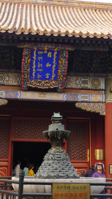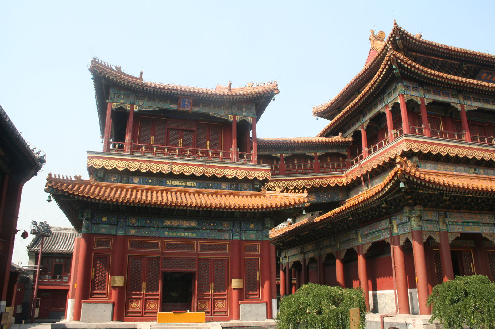 雍和宮(The Lama Temple)位于北京市區(qū)東北角,清康熙三十三年(1694年),康熙帝在此建造府邸、賜予四子雍親王,稱雍親王府。雍正三年(1725年),改王府為行宮,稱雍和宮。雍正十三年(1735年),雍正駕崩,曾于此停放靈柩,因此,雍和宮主要殿堂原綠色琉璃瓦改為黃色琉璃瓦。又因乾隆皇帝誕生于此,雍和宮出了兩位皇帝,成了“龍潛福地”,所以殿宇為黃瓦紅墻,與紫禁城皇宮一樣規(guī)格。乾隆九年(1744年),雍和宮改為喇嘛廟,特派總理事務(wù)王大臣管理本宮事務(wù),無定員??梢哉f,雍和宮是全國規(guī)格最高的一座佛教寺院。