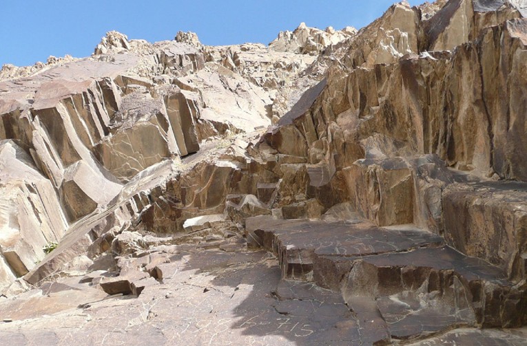 巖畫的內(nèi)容較豐富,主要以狩獵、放牧、征戰(zhàn)、動物、器物、自然物等為內(nèi)容。動物的種類包括虎、鹿、羊、野豬、狗、水鳥、老鷹等;人物有獵人、武士、牧人以及人獸一體的神靈形象;武器主要有弓箭、弩、長茅、刀、箭等;自然物包括太陽、月亮及植物等。上述的巖畫大部分為早期金屬時代的巖畫作品,通過這些作品真實的反映了班公湖地區(qū)古代游牧民族的生產(chǎn)和生活的生動場面,他們生活在大自然中,在改造大自然的同時,苦苦求索利用大自然,創(chuàng)造自己的美好生活。雖然巖畫的線條粗糙,造型顯得呆板,但質(zhì)實古樸,頗能引起游客思古之幽情.
