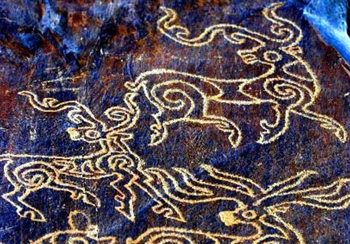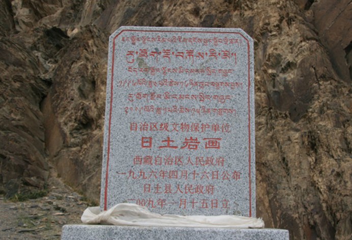 在西藏日土縣境內(nèi)的日松日姆棟、魯日納卡,日土山洞古壁畫是用堅硬的石頭或其它硬物在巖面或巖石上刻鑿而成,線條筆劃有深有淺,還有少數(shù)彩繪畫面。巖畫內(nèi)容十分廣泛,有狩獵、宗教祭禮、騎乘、放牧、農(nóng)耕、日、月、山、牛、馬、羊、驢、羚羊、房屋、人物等。