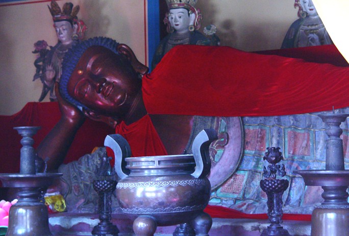 北京西山臥佛寺(Wofo Temple) 由于寺內有一尊巨大的釋迦牟尼銅像、臥佛寺由此而得名。臥佛身長5.2米,用銅25000公斤 、鑄佛用工7000人。銅佛作睡臥式,頭西面南側身躺在一座榻上,左手平放在腿上,右手彎曲托首頭部。據說這是釋迦牟尼的紀念像。旁邊站著12尊小佛像,是他的12個弟子。他們的面部表情沉重悲哀,構成一幅釋迦牟尼向12弟子囑咐后事的景像。殿的正面墻上掛一塊"得大自在”的橫匾,意思是得到人生真義也就得到最大自由。殿門上方亦有橫匾,書有"性月恒明”,意為佛性如月亮,明亮興輝永照。
