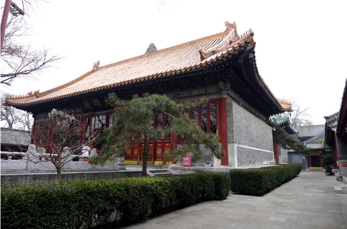 到廣濟寺朝禮的人們第一眼讓人注目的是天王殿。這里有明代仿唐三彩的四大天王,象征著“風(fēng)調(diào)雨順”。中間為明代銅彌勒像,與各地寺院看到的“大肚能容,容天下難容之事;開口常笑,笑世間可笑之人”的布袋和尚像不同。布袋和尚只是傳說中彌勒佛的化身形象,廣濟寺天王殿中所供奉的是——天冠彌勒。廣濟寺最大的殿堂是“大雄殿”?!斗ㄈA經(jīng)•從地涌出品》:“善哉!善哉!大雄世尊”。大雄是佛陀的德號,即偉大之英雄之意。佛具大智慧,能降伏魔障,故稱大雄。廣濟寺大雄殿是帝王所敕建,故著黃琉璃瓦。殿脊有香水海,又名華藏世界海,整體呈山形,由水、蓮花和一個梵字構(gòu)成,寓意永恒世界、不生不死。此種殿脊在北京地區(qū)獨此一家。大雄殿所供奉的三世佛,即西側(cè)過去世迦葉佛,中間是現(xiàn)在世釋迦牟尼佛,東側(cè)是未來世的彌勒佛。這樣的組合供奉方式與常見寺院所供奉的西方世界阿彌陀佛、本師釋迦牟尼佛、東方世界藥師佛組合完全不同。佛是智慧之身,法性平等,所表達的合掌皈依仰慈悲,舉頭見佛生歡喜的精神完全相同。