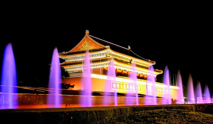 天安門位于北京城的傳統(tǒng)的中軸線上。由城臺(tái)和城樓兩部分組成,有漢白玉石的須彌座,總高34.7米。城樓上60根朱紅色通天圓柱,地面金磚鋪成,一平如砥;高大而色彩濃郁的墻臺(tái),上有兩層重檐樓,有黃色琉璃瓦,東西九間,南北五間,象征皇權(quán)的“九五之尊”。南北兩面均為菱花格扇門,36扇朱紅菱花門扉;天花、門拱、梁枋上雕繪著傳統(tǒng)的金龍彩繪和吉祥圖案;貼金的“雙龍合璽”彩錦,版權(quán)所有山東聊城聊之旅國(guó)際旅行社有限公司,轉(zhuǎn)載必究!團(tuán)龍圖案的天花藻井,使整個(gè)大殿莊嚴(yán)雄偉,金碧輝煌。殿內(nèi)由一個(gè)450公斤八角宮燈和16個(gè)各重350公斤的六角宮燈組成的眾星捧月圖案。