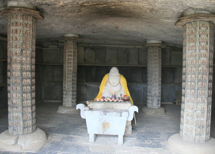 靜琬最初所刻的一百四十六塊石經(jīng)鑲嵌于洞內(nèi)四壁之上。洞中央有四根八角形石柱,每根柱上均有浮雕佛像,共一千多尊,稱千佛柱。由于山洞藏經(jīng)貯滿,遼金時代續(xù)刻的經(jīng)版就沒再運上山,而藏于云居寺南塔下地穴中。