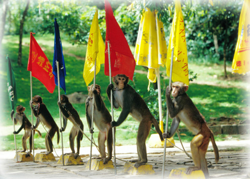 閑庭信步似的從容才是猴子們最為“尊敬”的態(tài)度。正是在這種從容中你已和猴子建立起相互尊重、相互信任的關(guān)系。當(dāng)你做到這一點(diǎn)時(shí),你就不會(huì)對在猴藝表演場上人猴同席觀看猴明星的雜技、小品表演的情形嘖嘖稱奇了,同時(shí)你也會(huì)充分享受到猴子們在你手上、腿上爭食、搶食,嬉鬧的樂趣。