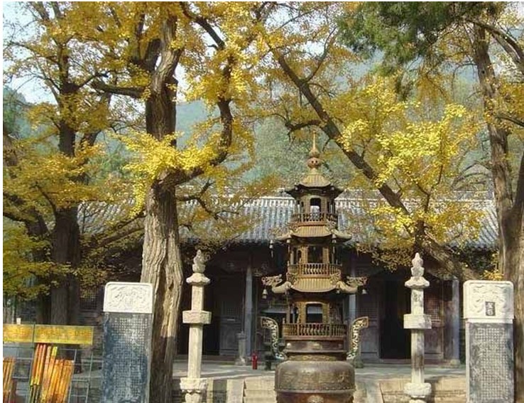 即千年銀杏樹。在禪林古寺周圍長著的十三株(一雄十二雌)蔽天遮日的古銀杏樹,植于秦代,樹齡2000年以上。至今仍枝繁葉茂,果實累累。雄樹最為高大,被稱為“龍種”,而其中一株雌樹滋生三代細(xì)樹,稱為“四世同堂”。樹心已腐朽,又在洞腹中生出一株粗大的銀杏,母子合一共擎蒼天,給人以神秘莫測之感。寺廟碑文曾記載:“先有禪林后有邊(邊,指長城),銀杏還在禪林前”。足以證明這十三株銀杏歷盡蒼桑已兩千多年。清代遵化州進士史樸到禪林寺巡視時亦留下贊頌詩句:“五峰高峙瑞去深,秦寺云昌歷宋金。代出名僧存梵塔,名殊常寺號禪林。巖稱虎嘯馴何跡,石出雞鳴叩有音。古柏高枝銀杏實,幾千年物到而今。”