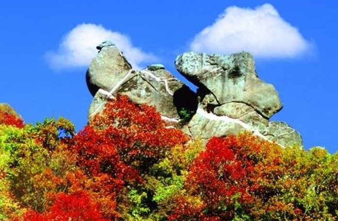 在白樺林附近,游路邊的山峰頂部,兩塊巨石狀如鴛鴦相依相偎。關(guān)于鴛鴦石,在當?shù)剡€流傳著動人五岳寨-鴛鴦石的神話傳說。