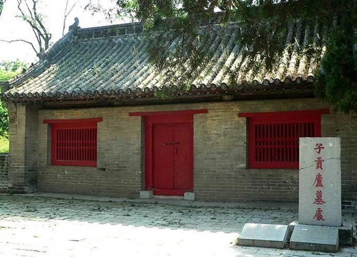 孔子墓西的3間西屋為子貢廬墓處??鬃铀篮螅姷茏邮啬?年,相訣而去,獨子貢在此又守3年。后人為紀念此事,建屋3間,立碑一座,題為“子貢廬墓處。”享殿之后,另有一座灰瓦攢尖頂?shù)姆酵?,稱“楷亭”。亭內(nèi)石碑上刻著一棵古老的楷樹,即摹自其南側(cè)的“子貢手植楷”。相傳子貢奔喪來后,將一棵楷樹苗栽于其師墓旁,后成大樹。清康熙間遭雷火焚死,后人將枯干圖象刻于石上。