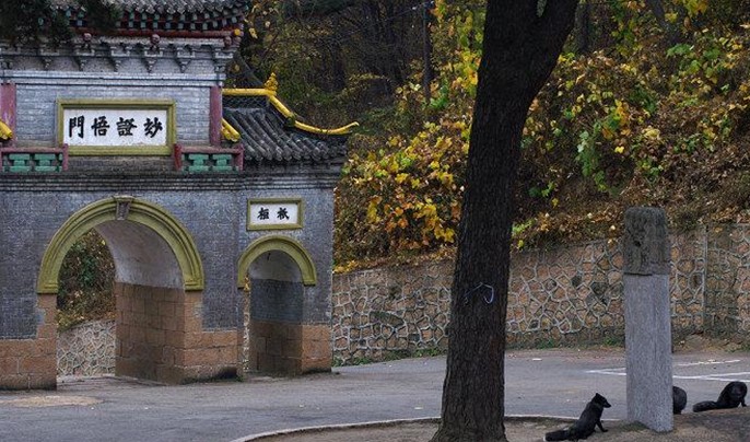 中會(huì)寺山門(mén)修建于民國(guó)23年(1934年),此山門(mén)是千山為數(shù)不多的排樓式的建筑,而在山門(mén)上有一副對(duì)聯(lián)寫(xiě)道“為滌塵襟尋寶剎,愿新廟貌煥靈光”,在橫額上寫(xiě)道“中會(huì)古剎”四個(gè)字,這也是中會(huì)一景,這副對(duì)聯(lián)意思是說(shuō)人們遠(yuǎn)離塵世的喧嘩與煩惱,來(lái)到了僻靜的古寺,希望嶄新的廟宇能煥發(fā)出神靈的光茫,庇佑著虔誠(chéng)的人們。兩側(cè)山門(mén)上有“林部”“哩汔”“祗垣”和“覺(jué)場(chǎng)”等,這些都是佛教用語(yǔ),是指中會(huì)寺是僧人們練功和休息的精室美舍。“尚禮松”如一位忠誠(chéng)的哨兵守衛(wèi)在山門(mén)前,又有如彬彬有禮的門(mén)童在歡迎諸位的到來(lái),它已經(jīng)在這里有400年的日日夜夜。