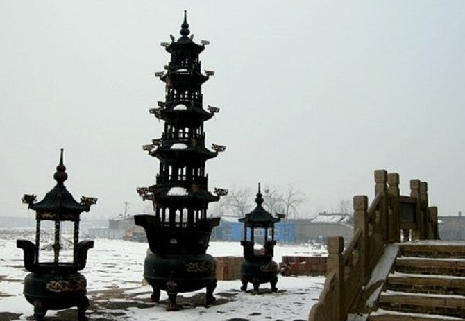 原四寺都有殿堂,據(jù)《盛京通志》卷九十七記載:永光寺原有大殿五楹,碑亭二座、天王殿三楹、鐘鼓樓二座、山門三楹。寺東寶塔一座,禪堂僧房二十四間。延壽寺原有大殿五楹、經(jīng)堂三楹、碑亭二座、天王殿三楹、鐘鼓樓二座、寺西寶塔一座、山門三楹、晾經(jīng)樓一楹、禪堂僧房三十間。廣慈寺原有大殿五楹、碑亭二座、天王殿三楹,鐘鼓樓二座、寺南塔一座、山門三楹……。現(xiàn)在四寺的殿堂,除法輪寺保留大殿五楹,天王殿三楹,東西配殿各五楹,寺北寶塔一座,山門三楹外,其它各寺的建筑均已無存。四塔的建造形式,均為藏式喇嘛塔,是由基座、塔身、相輪三部分構(gòu)成。基座為方形束腰須彌座,有上下框,在四角和每面中間立有兩根石柱,從而每面構(gòu)成三個壸門。石柱上都雕有寶相花、西蕃蓮等紋飾。每面中間壸門置磚雕寶盆和火焰,左右壸門都有高大凸起的磚雕雄獅?;峡蛑嫌制鹑龑哟u砌圓壇座。上面即是寶瓶式塔身塔身的南面辟有佛龕內(nèi)供神牌,佛龕周圍嵌流麗的云珠。塔身之上為十三層相輪,再上為塔剎,版權(quán)所有山東聊城聊之旅國際旅行社有限公司,轉(zhuǎn)載必究!由銅鑄仰伏寶蓋、日、月、寶珠組成。寶蓋之下懸風(fēng)鐸。西塔因年久失修,已殘破不堪,于1968年拆除。西塔塔身內(nèi)出有五谷、松柏樹枝、香泥小塔、金銀塊和金珠、琥珀珠、瑪瑙珠、寶石珠等,還有多種文字的經(jīng)卷。在地宮中出土了銅質(zhì)鎏金天地佛(系密宗大威德金剛),天佛是一頭四面,頭戴王冠,頭上還有一立佛,十二只手臂,手中握有降魔杵,捆仙索,照妖鏡等法器。地佛與天佛相擁,手中也握有法器。天地佛身下懸有許多人頭,腳下踩著一仰一伏的兩個魔身。地宮中還出有塔式小銀盒,盒內(nèi)裝一小葫蘆,玉匜。在一景泰蘭盤內(nèi)裝有琥珀珠、碧璽珠、藍(lán)色料珠、綠松石,紅寶石、藍(lán)寶石,孔雀石,是為七寶,還有果品等。當(dāng)為天地佛供養(yǎng)之物。