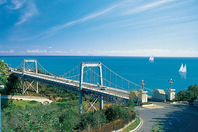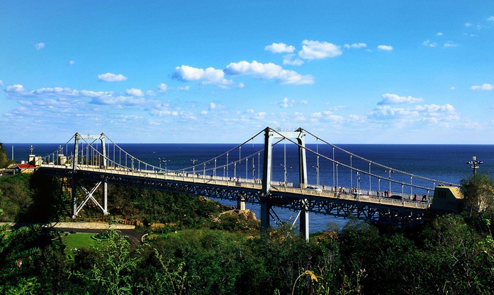 該橋1984年5月開工,三年后正式通車。雄偉的橋臺(tái),高高的橋塔架聯(lián)接著長長的主鋼索,通過吊索使一個(gè)平展的橋面穿狹谷而過,氣勢雄偉,磅礴蒼勁,像一高大巨人雙臂把兩座山嶺聯(lián)接起來。過了北大橋繼續(xù)向西走,就來到了燕窩嶺景區(qū)和秀月峰景區(qū)。 位于大連市濱海路上,全長228米,三跨鋼懸索橋,主跨132米,邊跨2*48米,寬12米,主塔為鋼箱截面,混凝土重力錨錠,造價(jià)1400萬元。版權(quán)所有山東聊城聊之旅國際旅行社有限公司,轉(zhuǎn)載必究!橋梁全長228米,中跨132米,邊跨2*48米 。 橋面寬12米,其中車行道9米,人行道2*1.5米 。橋上雙向兩車道,橋上縱坡 0%。三跨懸索橋,跨徑為48米+132米+48米,加勁梁為鋼桁架,梁高3米 • 主塔為鋼箱截面,混凝土重力錨碇 .