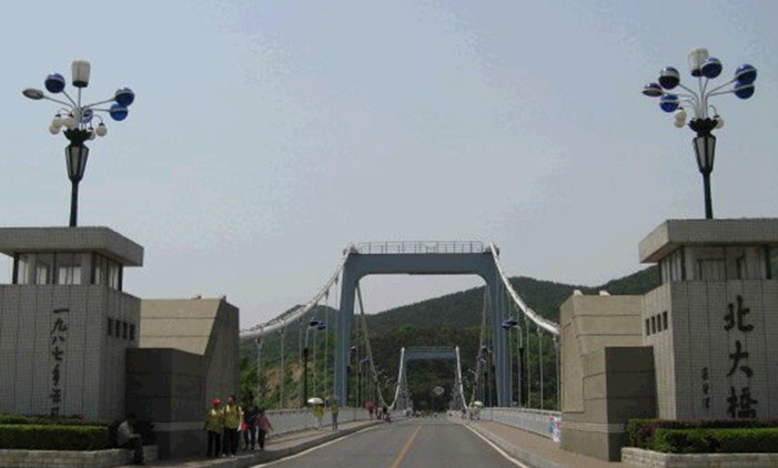 北大橋位于大連海濱風(fēng)景區(qū)中的老虎灘景區(qū)與燕窩嶺景區(qū)之間,是一座近海臨山橫跨山谷的旱橋。它是貫穿整個(gè)大連海濱風(fēng)景區(qū)東西濱海路的要沖,而且也是老虎灘景區(qū)西部和鄰近的燕窩嶺景區(qū)中一壯觀秀麗的風(fēng)景點(diǎn)。 該橋?yàn)槿绾喼Ъ觿盆旒軕宜鳂颍L230米,中跨跨徑132米,橋?qū)?2米,其中車行道寬為8米。主索矢高13.2米,矢跨比1:10。