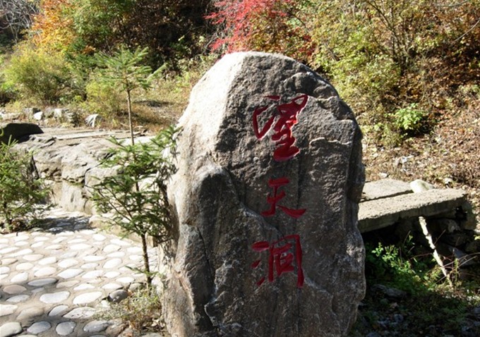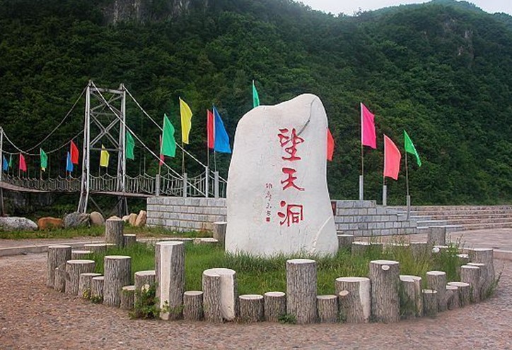 望天洞位于雅河鄉(xiāng)彎彎川村東70余米高的山頂上。該洞發(fā)育于20萬年前,洞總長 7000余米,洞內(nèi)最大的廳6000余平方米,可容納萬人。全洞4大景區(qū)100余景點。洞內(nèi)的迷宮更為奇特,被稱為“北國第一洞,迷宮世無雙”。此洞兩個洞口并列,中間一道兩抱多粗的石梁。右側(cè)洞口有50平方米,洞口石壁上一只展翅昂首的大鳥,面向東方,形象逼真,名曰“鯤鵬朝陽”。左側(cè)洞口有35平方米。兩個洞口酷似一副巨大的眼鏡放在山巔。沿左側(cè)洞口石壁扶鐵欄踏石階經(jīng)“通天橋”,下行30余米,便是該洞的第一大廳--“聚仙廳”,寬闊高大,可納千人。回首仰望,兩道光柱直射廳中,使人有懷抱紅日、目接青天之感。若在春冬季節(jié)或雨、雪之后,廳內(nèi)云霧繚繞,從洞口向上升騰,云霧與洞口綠樹交相輝映,更是妙不可言。