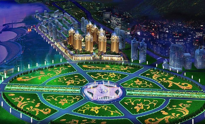 從廣場中央大道中心點往北500米是會展中心;往南是百年城雕廣場,500米外是藍色的大海。中央大道紅磚鋪地,兩側(cè)綠草如茵,每隔20米設一個航標燈造型的石柱燈,象征著中國正面向大海,走向世界。