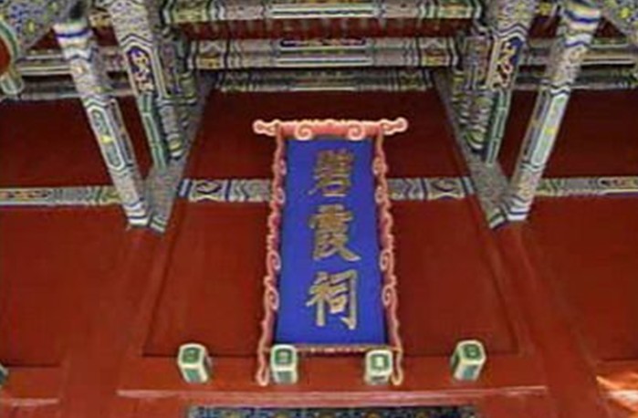 殿內(nèi)槽柱上施四柁隔架斗拱。柱上施井字形天花板,正間內(nèi)斗拱相圍呈八角形藻井,中間高浮雕盤龍戲珠。正間和西次間均設(shè)石雕仰覆蓮紋須彌座神臺(tái):正間神臺(tái)裝木構(gòu)雕花神龕,祀元君銅像,兩側(cè)為眼光、送生兩神銅像;東次間神臺(tái)供眼光奶奶及二侍女銅像,西次間神臺(tái)供送子娘娘和二侍女銅像。正殿內(nèi)懸康熙帝巨匾“福綏海宇”。