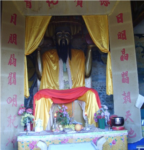 地處河北省滄州市北的青縣城南6公里有村曰“大盤古”,村西有座盤古廟。盤古廟始建于元世祖至元十五年(1278年),明弘治和崇禎年間曾重修,清康熙二十七年(1688年)因河流沖刷,設于秋祠西南重建,均有碑記。據文獻記載和民間傳說,當年的盤古廟狀似北京的故宮三殿,石、磚、木結構,琉璃瓦蓋頂,金碧輝煌,蔚為壯觀。前殿高三丈六尺,象征一年360天;臺階18級,為18層地獄之說;飛檐椽子108根,按36天罡、72地煞而布;每根椽頭系銅鈴一枚,照工、商、角、征、羽五音而置,有所謂“風搖鈴響天動樂,光照殿頂地生輝”之說。殿內有身披樹葉,手托日月的鐵鑄涂金盤古像,高一丈零八寸。中殿塑有南海觀音像,股坐蓮盆,金童玉女立兩側。版權所有山東聊城聊之旅國際旅行社有限公司,轉載必究!后殿設老君、孔子、龍王三塑像,殿前有合抱粗的合歡樹兩株,殿后鐵磬懸于古槐。可惜盤古廟在1947年毀于戰(zhàn)火。九十年代,當地群眾組織起來修復盤古勝跡,以滿足來此朝圣拜祖的人流尋訪。