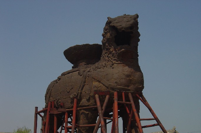 河北滄州鐵獅子鑄于后周廣順三年(公元953年),距今已有一千多年的歷史,采用“泥范明澆法”鑄成,具有較高的歷史科學(xué)和藝術(shù)價(jià)值,為全國重點(diǎn)文物保護(hù)單位。通寬5.35米,身長6.30米,身高6.6米,體寬3.0米,重約40噸,素有“獅子王”的美譽(yù),一千多年來,它飽經(jīng)滄桑,在古滄州,它曾被當(dāng)成神物供奉,享盡了香火;在烽火連天、哀鴻遍野的戰(zhàn)亂年代,又經(jīng)受了刀戈的砍殺,在獅體內(nèi)外斑痕累累。