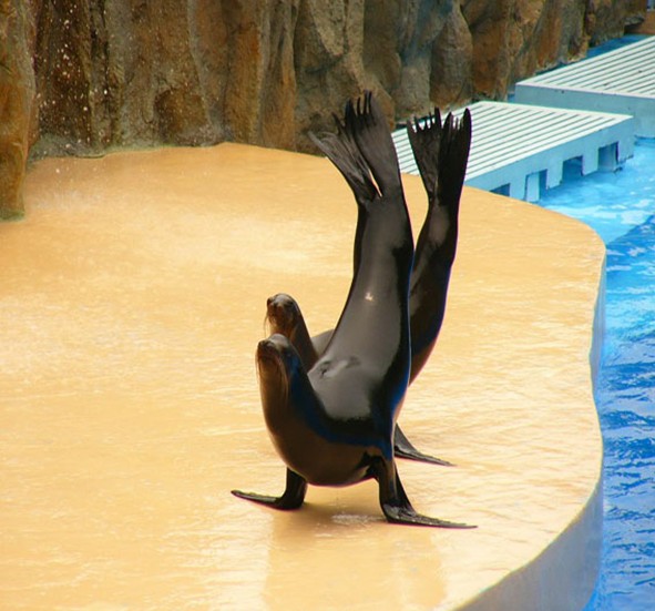 1997年5月從烏拉圭引進的4頭南美海獅(分別起名為“歡歡”、“樂樂”、“海海”、“琴琴”)更是非常聰明、可愛,是海獸表演家庭的幽默大師,別看它們其貌不揚,可在馴養(yǎng)師的嚴格訓練下,也能表演“握手”、親吻、問候、套圈、學人走路、鼓掌、再見、翻滾以及高難度的“頂球”、“單手倒立”、“一獅兩球”、《海獅學校》等近20余個精彩節(jié)目,其幽默滑稽的表演,令觀眾捧腹大笑。