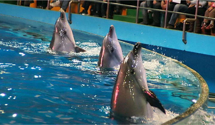 館內所馴養(yǎng)的海獸有6頭北太平洋寬吻海豚;4頭南海獅、4頭加州海獅;3頭斑海豹;40余個品種2000余尾熱帶魚等供游客觀賞。其中6頭海豚聰明、溫順、敏捷,每頭體重250-300公斤不等,身長2.5--3.0米左右。每天每頭需吃魚25-30公斤。在馴養(yǎng)師的引導下,能夠表演:唱歌、跳舞、轉呼拉圈、雙豚抱球、高空頂彩球、“浪漫騎士”、“飛旋舞步”等20多個新奇精彩的節(jié)目。