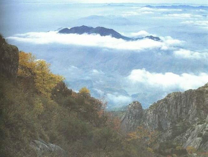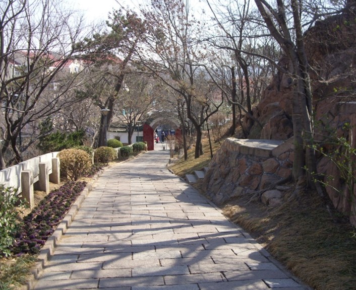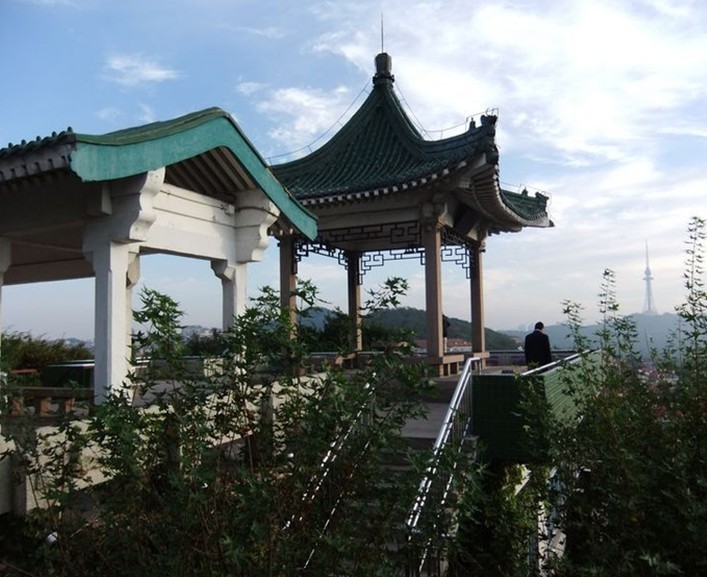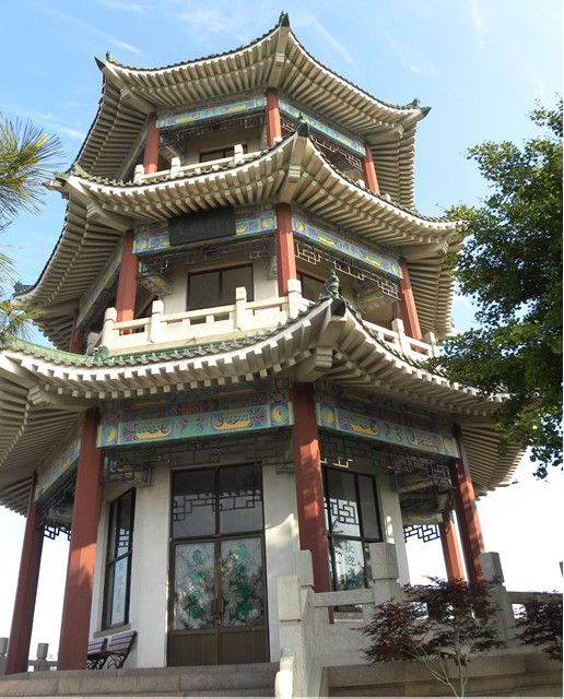 我們從小魚山的大門抬階而上,看到的這個亭子是一個挑檐式的六角亭,在亭內(nèi)可以把碧波蕩漾的匯泉灣一覽無余,故得名“碧波亭”。“碧波亭”的匾額“碧波”二字是由著名的國畫藝術(shù)大師吳作人手書的。大家看遠處的山上有三棟紅色蘑菇樓宛如三柄熊熊燃燒的火炬,那是青島市十大山頭公園之一的信號山公園。在半山腰綠樹叢中的那棟別具特色的建筑是青島市迎賓館,原是“德國總督府官邸”。我們再由“碧波亭”拾階而上,站護欄邊可以看到右下邊有兩幢民族式建筑,一座形如城樓,一座貌似宮殿,那就是青島市海產(chǎn)博物館。