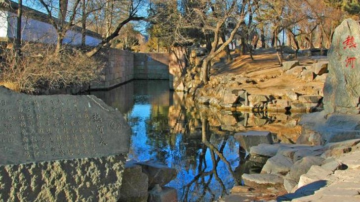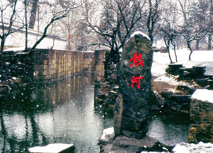 位于避暑山莊湖區(qū)東北隅,是山莊湖泊的主要水源。清澈的泉水從地下涌出,流經(jīng)澄湖、如意湖、上湖、下湖,自銀湖南部的五孔閘流出,沿長(zhǎng)堤匯入武烈河。熱河全長(zhǎng)700多米,在一般地圖上找不到它有蹤跡。它是中國(guó)最短的河流。熱河發(fā)源于避暑山莊諸泉的一條涓涓細(xì)流,主要水源來(lái)自熱河泉。冬季水溫為8℃。泉側(cè)有巨石,刻“熱河”兩字。