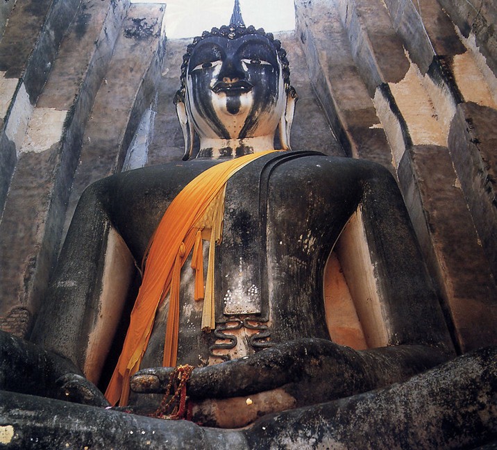 在果園和谷地的中間,是茂盛的大草原,草原延伸過一個(gè)山谷,與山谷平行的是一條發(fā)源于中國(guó)邊境的山上的河流,湄公河即由此流過。在一片芒果和椰子棕櫚的風(fēng)景之后,有一個(gè)聳立的高塔,帶著尖塔的圓屋頂連同巨大的雕像一起矗立在下層叢林中,幾乎覆蓋了一群更小的建筑遺跡,即一個(gè)古城所留下的歷史遺跡。矗立在城墻和護(hù)城河旁邊的建筑物便是神殿、寺廟和修道院,仿佛最初建造這個(gè)城市并且利用泥土和樹木做房屋的人們只想把他們的精神傳給子孫后代似的。素可泰是這個(gè)城市的名字,它在13世紀(jì)和15世紀(jì)時(shí)期是國(guó)家的首都,它的全部歷史便是泰國(guó)歷史的開端。公元13世紀(jì)中葉,隨著王國(guó)的建立,新的朝代開始了,泰國(guó)人逐漸壯大,泰國(guó)的領(lǐng)土擴(kuò)展到整個(gè)地區(qū),從緬甸(東南亞國(guó)家)一直到柬埔寨,向南部一直擴(kuò)展到馬來(lái)西亞半島那么遠(yuǎn)。在200年的時(shí)間里,素可泰一直是這種擴(kuò)展力量背后的精神支柱。公元15世紀(jì)的上半葉,這個(gè)城市開始走向衰落。取而代之的是南部的大城得以建立,逐漸成為國(guó)家的政治中心。