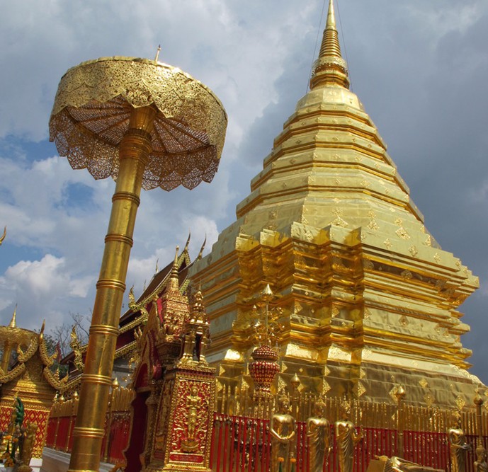 泰國(guó)清邁位于曼谷北方海拔305米的山谷中,有“北方玫瑰”之稱,山清水秀景色絕美,且人文古跡眾多,深受國(guó)內(nèi)外游客青睞。最著名的是雙龍寺,建于十六世紀(jì),寺院由裝飾美麗的建筑和藍(lán)納式佛塔組合而成,青山環(huán)抱莊嚴(yán)肅穆,鎮(zhèn)寺之寶是佛祖的一粒舍利子。雙龍寺附近有苗族村,這個(gè)村既是一個(gè)景點(diǎn)也是苗族后裔生活工作的地方,他們保持有自己的語(yǔ)言,傳統(tǒng)服裝及手工藝品,是古少數(shù)民族的一個(gè)活標(biāo)本,游人身臨其境,可采風(fēng)到不少少數(shù)民族風(fēng)情,同時(shí)品嘗到當(dāng)?shù)靥厥庑〕浴?