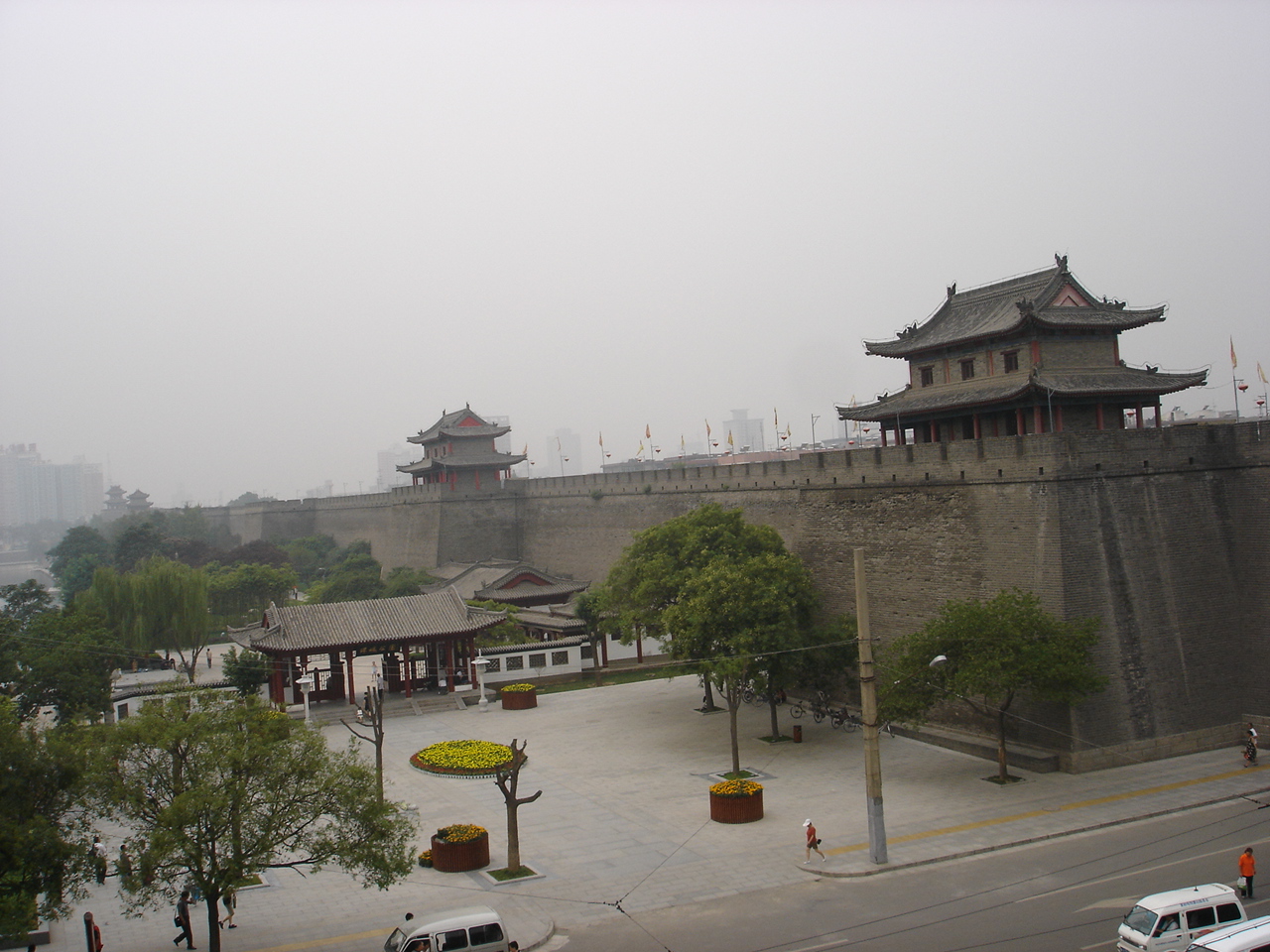 西安明城墻,位于西安市中心區(qū),呈長(zhǎng)方形,墻高12米,底寬18米,頂寬15米,東墻長(zhǎng)2590米,西墻長(zhǎng)2631.2米,南墻長(zhǎng)3441.6米,北墻長(zhǎng)3241米,總周長(zhǎng)11.9公里。有城門四座:東長(zhǎng)樂門,西安定門,南永寧門,北安遠(yuǎn)門,每個(gè)城門都由箭樓和城樓組成?,F(xiàn)存城墻建于明洪武七年到十一年(1374-1378),至今已有600多年歷史,是我國(guó)現(xiàn)存最完整的一座古代城垣建筑。