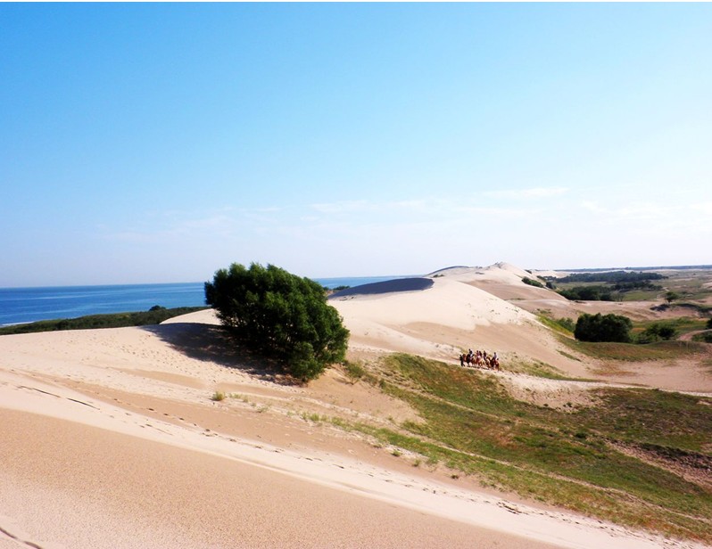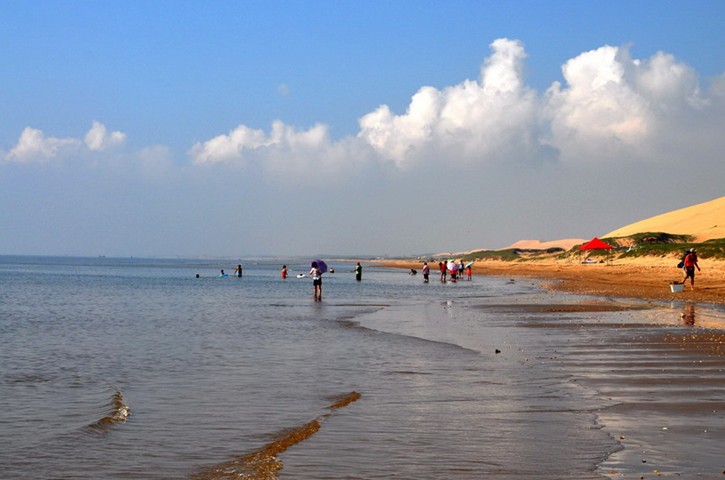 沙山“借得江南綠葉裝點(diǎn)半島翡翠,移來塞北黃沙成就大漠風(fēng)光。”風(fēng)景絕佳襲人之處,誰來巧解天然之謎?進(jìn)入翡翠島景區(qū),放眼遠(yuǎn)眺,高大起伏的黃色沙丘連綿不絕,恍然如置身于戈壁大漠。翡翠島的大漠如長龍臥波,從東面延伸過來,然后呈30度角折向西南的海里。金色的沙丘,綿軟似綢緞,渾圓似巨蛋,曲線似魚脊,嫻靜似處子。不信你就來親身體驗(yàn)吧!