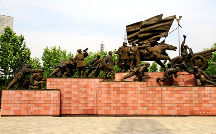 紀(jì)念廣場(chǎng)總體環(huán)境藝術(shù)以勝利為主旋律。兩根高大花崗巖圓柱構(gòu)成勝利門(mén),柱頂分別佇立著人民解放軍東北野戰(zhàn)軍和華北軍區(qū)部隊(duì)?wèi)?zhàn)士雕像。兩壁反映軍民團(tuán)結(jié)奮戰(zhàn)、歡慶勝利的花崗巖浮雕墻分列勝利門(mén)兩旁。廣場(chǎng)中央豎立著高64米的勝利紀(jì)念碑,不銹鋼三冷刺刀直插云霄。廣場(chǎng)東西兩側(cè)的大型鍛銅群雕,烘托出人民戰(zhàn)爭(zhēng)的磅礴氣勢(shì)。