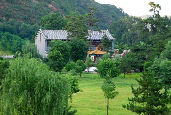閣的東北部有水門與山莊水系相通,閣前池水清澈,人在閣前特定位置向池中望去,只見池中有一彎新月,隨波晃動,而天空卻是艷陽高照。原來這是造園家在池南的假山上,開出一個半圓形如上弦月的縫隙,利用光線,在水中形成下弦月的倒影,構(gòu)成“日月同輝”的奇特景觀。水池南岸是一座造型別致的假山,怪石嶙峋,氣勢雄渾。假山占地約800平方米,用石3279立方米,由漿石和雞骨石等堆疊而成。假山石洞,前后各有兩門相通,結(jié)構(gòu)也頗具匠心。洞內(nèi)山石遮掩,可分廳、堂、窗、孔、穴等,洞壁用雞骨石鑲嵌,幽深曲折。有幾個大小不等的窗孔,透進幽幽的光線,使洞中的峭壁怪石若隱若現(xiàn)。山上橫嶺縱峰,溝橋崗壑,各自爭奇。有棒槌山、羅漢山、雙塔山等十大名山的縮影,更有“十八學士登瀛洲”的造型,還有仿米芾“寶晉齋”的園林布局。文津閣東為碑亭,四角攢尖頂,上覆黃琉璃瓦,內(nèi)豎石碑一座,通高5.34米,碑正面鐫刻著乾隆題《文津閣記》,其余三面刻有乾隆作的3首詩。文津閣庭院,由粉墻圍繞,是山莊的園中之園。這組建筑,坐北朝南,依次布置著門殿、假山、水池、藏書樓、花臺、曲池、山石、月門。東側(cè)有碑亭和值房3間。閣前池水清澈,澄泓見底,水草叢生。池南假山呈半月形環(huán)抱池沼,版權(quán)所有山東聊城聊之旅國際旅行社有限公司,轉(zhuǎn)載必究!拱峙摟閣,疊石大多仿承德十大景堆砌,與山莊西山渾為一體。假山上有賞月的月臺,其西有趣亭(已不存)。假山上有磴道,下有洞府,入門進閣,必經(jīng)此洞。石洞曲折幽邃,洞頂有一曲形石孔,光線漏射到池水中,恰如一彎新月,每當麗日當頭,水池中卻素月高懸,“抬頭看日,低頭觀月”,日月同輝,景觀絕妙,又為山莊一絕。