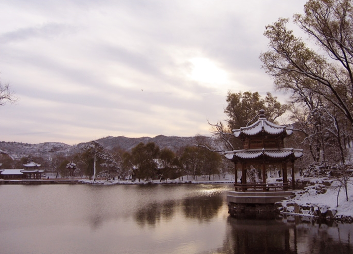 每逢中秋佳節(jié)之際,天高氣爽,登臨“月臺”賞月,但見園內(nèi),老樹蒼勁,枝杈縱橫。一輪明月冉冉升起,把一片銀輝灑向大地,山莊頓時銀裝素裹,更顯得清澈靜謐。文津閣假山的造型藝術(shù),集中了米翁寶晉齋和范氏天一閣之長,運用傳統(tǒng)疊山技法,結(jié)合北方雄壯的特點,風格一反南方小巧玲瓏之態(tài),而是雄偉、渾厚、氣勢磅礴的藝術(shù)作品。