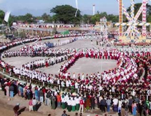 1958年,在密支那修建了永久性的目瑙祭壇,嗣后每年都在這里舉行全邦性的目瑙會。目瑙埸建在江邊,埸地寬闊,設有西門和北門。兩門頗有民族特色,是一個模子倒出來的。門枋是一對象牙抬著一扇铓,兩側是四根交叉的雌雄目瑙柱,門衛(wèi)是兩位手持長刀和梭鏢的克欽先民武士。目瑙祭壇與德宏的大同小異,德宏的是四根直立的雌雄柱,中間是兩把雌雄刀;密支那的是十根交叉的雌雄柱,中間有一根橫桿固定其交叉部位。其共同點是基座均為犀鳥,雌柱上繪的蕨葉藤和雄柱上的三角圖案相似,中間兩根雌雄柱頂端各繪著月亮和太陽,南側建有祭鬼崗樓。目瑙柱北邊矗立著一座龐大的目瑙房,這是一所典型的克欽族現代建筑,不僅氣派豪華,而且極富民族特色。尤其是陽臺上的7根粗實巨大的中柱,繪滿了豐富多彩的民族圖案,它象征著克欽族由7個支系組成,在牛頭文化精神的引領下,克欽族將獲得新生。