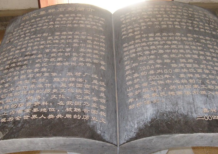 武氏墓群石刻,俗稱武梁祠.位于嘉祥縣城南15公里紙坊鎮(zhèn)武翟山村.原是東漢末年嘉祥仕宦世家武氏的一處祠堂,祠堂始建于桓帝建和元年(公元147年)祠內(nèi)石刻包括石 、石獅、墓碑、畫像等。有石闕、石獅各1對,漢碑2塊和武氏祠漢畫像石44塊。它是國家一級重點(diǎn)文物保護(hù)單位,為世界文化遺產(chǎn)中的瑰寶。