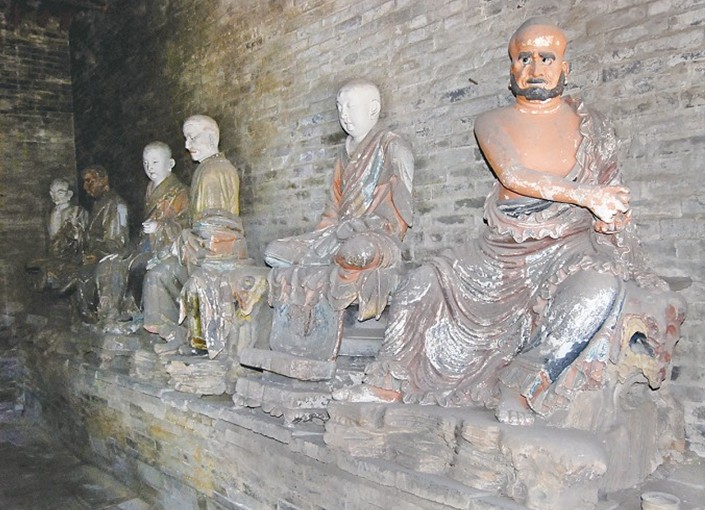 與一般漢地佛寺相同的是,大殿內(nèi)共塑有十八羅漢,其分布是東、西兩側(cè)各九位羅漢。羅漢全稱為阿羅漢,他們是佛的得道弟子,是小乘佛教修行所獲的最高果位(據(jù)說修到了羅漢的境地,就已經(jīng)斷盡三界煩惱,永遠(yuǎn)解脫輪回之苦)。