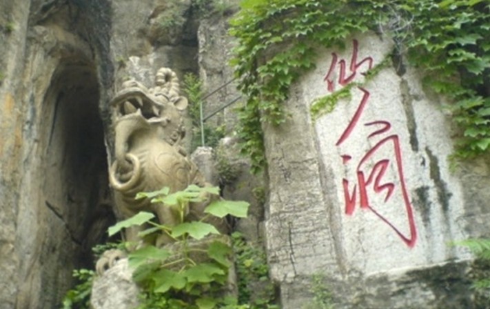 此地懸崖環(huán)列,危巖欲墜。上有蒼松圍繞,下有銀杏凌空,林木茂密,青苔掩映,山光嵐氣,令人迷戀,故歷代游客共推勝地。叢柏庵北有深邃山洞,可容千人,半明半暗,幽曲穹窿,南北兩門,中間相通,還有天窗,上下兩層。三伏盛夏,洞中寒氣襲人,入內(nèi)小憩,氣爽神清,別有天地,猶如仙境,因名仙人洞。