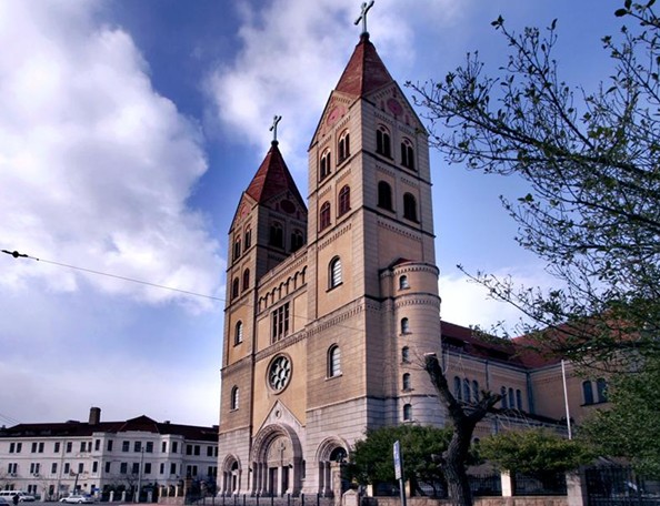占地面積11480平方米,其中建筑面積6301.54平方米。教堂以黃色花崗巖和鋼筋混凝土砌成,表面雕以簡(jiǎn)潔優(yōu)美的紋案。窗戶為半圓拱形,線條流暢,顯得莊重而樸素。大門上方設(shè)一巨大玫瑰窗,兩側(cè)各聳立一座鐘塔,塔身高56米,紅瓦覆蓋的錐形塔尖上各豎立一個(gè)4.5米高的巨大十字架,塔內(nèi)懸有四口大鐘,一但鐘樂鳴奏,聲傳數(shù)里之外。