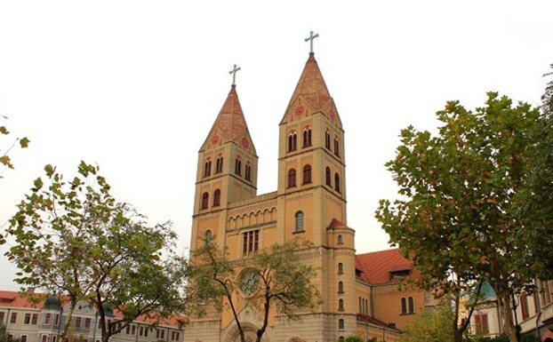 占地面積11480平方米,其中建筑面積6301.54平方米。教堂以黃色花崗巖和鋼筋混凝土砌成,表面雕以簡(jiǎn)潔優(yōu)美的紋案。窗戶為半圓拱形,線條流暢,顯得莊重而樸素。大門上方設(shè)一巨大玫瑰窗,兩側(cè)各聳立一座鐘塔,塔身高56米,紅瓦覆蓋的錐形塔尖上各豎立一個(gè)4.5米高的巨大十字架,版權(quán)所有山東聊城聊之旅國(guó)際旅行社有限公司,轉(zhuǎn)載必究!塔內(nèi)懸有四口大鐘,一但鐘樂鳴奏,聲傳數(shù)里之外。進(jìn)入教堂,是一個(gè)高達(dá)18米,可容千人的寬敞明亮的大廳,色彩斑斕的玻璃花窗透射出柔和的光線。大廳東西兩側(cè)設(shè)有走廊,后面設(shè)有兩個(gè)大祭臺(tái),四個(gè)小祭臺(tái),廳的穹頂繪以圣象壁畫,燈光炫目,充滿濃厚的宗教氣氛。屋頂覆蓋舌頭紅瓦,其氣勢(shì)龐大,且又古樸典雅。