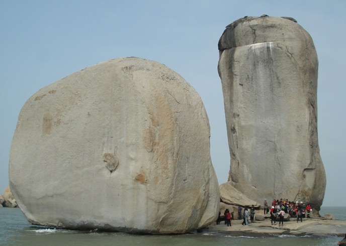 從看澳村岸邊坐渡船,十幾分鐘就到達(dá)礁石上,礁石底部是一組平坦完整的巖石。兩個石柱均由粗?;野咨幕◢弾r組成 東側(cè)的一個高達(dá)33米,胸寬9米,厚8米,周長57米;西側(cè)的一個高17米,胸寬15米,厚8米周長39.9米。兩個石柱的底部都是近似四方形體,直立在礁石上。據(jù)地質(zhì)學(xué)家考證是世界上最大的花崗巖球狀風(fēng)化海蝕柱。