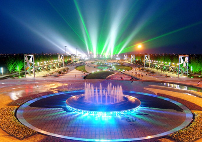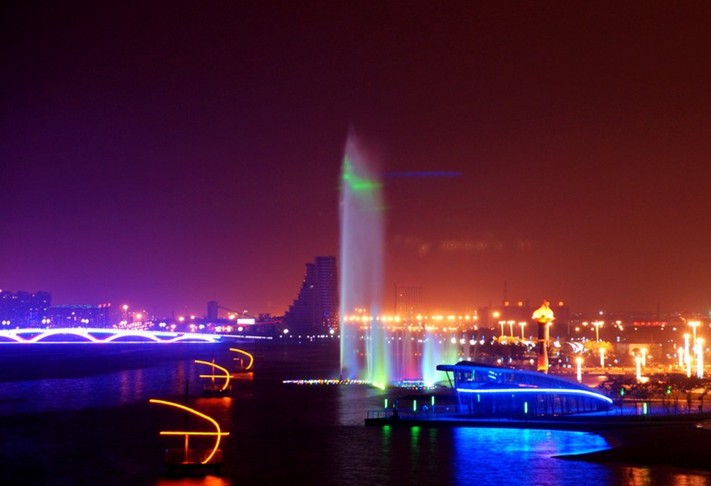 太陽廣場,占地9萬平米,最多可容納觀眾3萬人,中國水上運動會開幕式在這里舉行。廣場以“水”為創(chuàng)作元素,西部入口處是一個圓形噴泉;中間是一條蜿蜒曲折的溪流水景帶,溪流上建有幾座設(shè)計別致的小型景觀拱橋,溪流帶中間安放6組水上運動造型的鑄銅雕塑;廣場兩側(cè)各有兩組燈光廊架,白天是造型別致的雕塑,夜晚是絢麗多姿的燈光景觀。太陽廣場東側(cè)環(huán)抱水域中的是水中舞臺,有百米地下通道與舞臺水中地下室相通;舞臺東側(cè)是大型音樂噴泉,這是目前我省最大的音樂噴泉,也是國內(nèi)為數(shù)不多的大型海水音樂噴泉之一,它有十多種水型變化,噴泉長112米,最大寬度為70米,主噴噴射高度達(dá)80米,是全國為數(shù)不多的海水噴泉之一。噴泉下面設(shè)有浮排和浮箱裝置,可以根據(jù)需要自由升降,配合燈光變幻,造型萬千,美不勝收。南端是一組彰顯海洋文化和水上運動特色的文化景墻,幾十座景觀照明燈在廣場中間赫然而立,盡顯雍容華貴。左側(cè)臨水處是幾組伸向瀉湖水中的瀕水大臺階,整齊流暢、恢宏大氣。