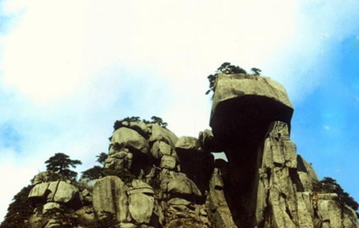 再往前走,有塊大石頭,叫“紗帽石”。長(zhǎng)約10米,寬、高約8米,極像古裝戲中士大夫所戴的烏紗帽。相傳從明朝永樂(lè)年間開(kāi)始,歷朝歷代,都有達(dá)官貴人騎著馬,坐著轎,專(zhuān)程前來(lái)焚香朝拜,以求加官晉爵,據(jù)說(shuō)有求必應(yīng)呢。從這順著臺(tái)階,可以到達(dá)天門(mén)臺(tái),沿路步移景換,美不勝收。自天門(mén)臺(tái)、“結(jié)義松”上行50米,就到了拜佛臺(tái),這是游人能夠登上的最高點(diǎn),海拔1460米。站在這里,險(xiǎn)峻的正頂已近在咫尺,仿佛舉手可及,卻又險(xiǎn)不可攀,至今還無(wú)人登臨。向前看去,那就是“天生石佛”,你看他天庭飽滿(mǎn),雙眼微合,鼻梁中挺,還有那豐盈的下巴和靈秀的頸項(xiàng),一副慈眉善目的富態(tài)之相。當(dāng)雨后初晴,偶爾會(huì)出現(xiàn)一道七彩虹,籠罩在大佛的頭頂上,那就是神奇的佛光,是石佛顯圣的吉祥征兆。過(guò)去,不論什么人,只要看到佛光,便要立刻下拜,因?yàn)榭吹剿鼧O不容易,所謂有緣者方可一見(jiàn),“拜佛臺(tái)”亦由此而來(lái)。在拜佛臺(tái)上舉目四望,東南方的天柱山,西向的司空山,北面的明堂山,還有大大小小的峰巒丘壑,都盡收眼底,豪邁之情油然而生。