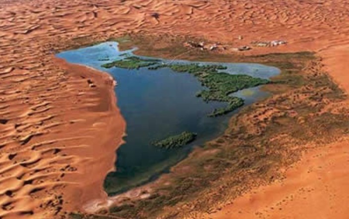 騰格里沙漠月亮湖旅游區(qū) 位于中國內(nèi)蒙古阿拉善盟境內(nèi)騰格里沙漠腹地,月亮湖是距離國內(nèi)各大城市半徑最短的沙漠探險營地,是現(xiàn)代都市人尋求緊張競爭生活之外的驚險刺激與徹底放松身心的最佳游程。月亮湖有三個獨特之處:一是形狀酷似中國地圖:站在高處沙丘一看,一幅完整的中國地圖展現(xiàn)在眼前,蘆葦?shù)姆植几菍⒏魇^(qū)一一標明;二是湖水天然藥浴配方:面積三平方公里的湖水,富含鉀鹽、錳鹽、少量硭硝、天然蘇打、天然堿、氧化鐵及其它微量元素,與國際保健機構(gòu)推薦藥浴配方極其相似。