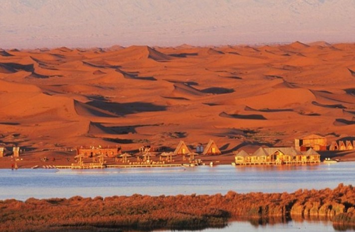 騰格里沙漠月亮湖旅游區(qū) 位于中國內(nèi)蒙古阿拉善盟境內(nèi)騰格里沙漠腹地,月亮湖是距離國內(nèi)各大城市半徑最短的沙漠探險營地,是現(xiàn)代都市人尋求緊張競爭生活之外的驚險刺激與徹底放松身心的最佳游程。月亮湖有三個獨特之處:一是形狀酷似中國地圖:站在高處沙丘一看,一幅完整的中國地圖展現(xiàn)在眼前,蘆葦?shù)姆植几菍⒏魇^(qū)一一標明;二是湖水天然藥浴配方:面積三平方公里的湖水,版權(quán)所有山東聊城聊之旅國際旅行社有限公司,轉(zhuǎn)載必究!富含鉀鹽、錳鹽、少量硭硝、天然蘇打、天然堿、氧化鐵及其它微量元素,與國際保健機構(gòu)推薦藥浴配方極其相似。湖水極具生物凈化能力,能迅速改善、恢復自然原生態(tài)本色。三是千萬年黑沙灘:長達一公里,寬近百米的天然浴場沙灘。推開其表層,下面是厚達十多米的純黑沙泥,其質(zhì)地遠超死海的黑泥,更是天然泥療寶物。景區(qū)水、電、通訊設施齊備,交通便利,有黑色油路直達景區(qū)接待站。距銀川機場、火車站130公里左右。