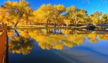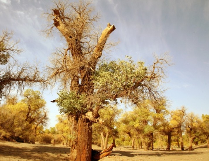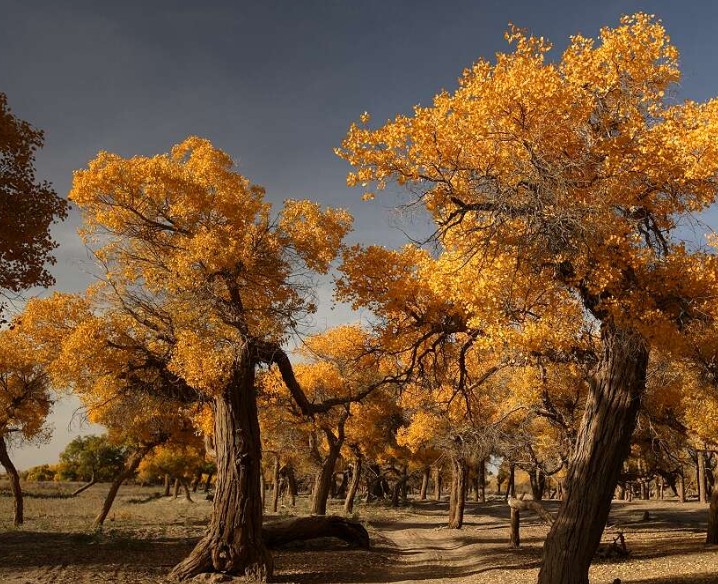 內(nèi)蒙古阿拉善盟的額濟納旗,現(xiàn)有天然胡楊林45萬畝,是世界僅存的三大胡楊林之一,是國家自然保護區(qū)和國家森林公園。胡楊林是一個古老的樹種,被譽為“植物活化石”,有“生一千年不死,死一千年不倒,倒一千年不朽”的美譽。胡楊,又名“梧桐”,為古地中海殘遺物種,屬落葉喬木,蒙古語稱為“陶來”。胡楊木質(zhì)纖細(xì)柔軟,樹葉闊大清香,耐旱,生命力頑強,是自然界稀有的樹種之一。金秋十月,額濟納是一個童話般的世界。胡楊金葉掛滿枝頭,細(xì)細(xì)看來,在樹枝間竟尋不到一片異色葉子,密密匝匝,金光燦爛,至純至美;遠(yuǎn)遠(yuǎn)望去,一片片金色的胡楊把大漠裝點得如詩如畫,匯集成金色的海洋,吸引著大批國內(nèi)外賓客到此旅游、采風(fēng)、攝影。